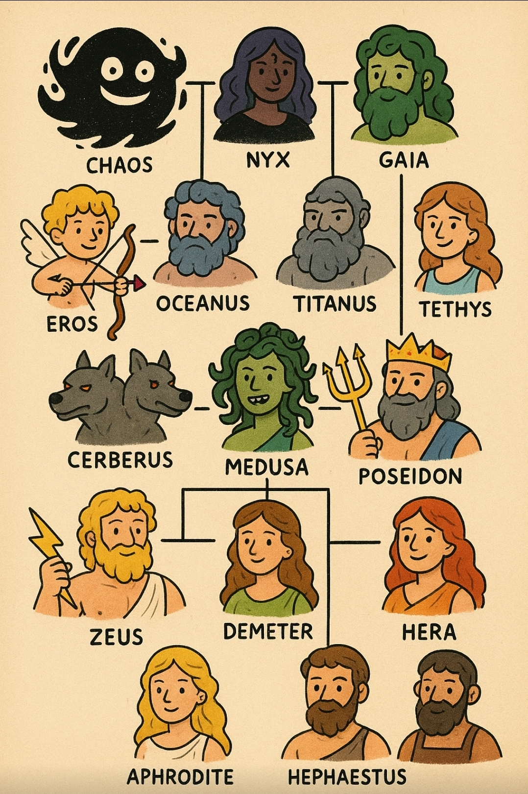 크로노스 + 레아 → 주요 올림포스 6남매가 태어납니다.