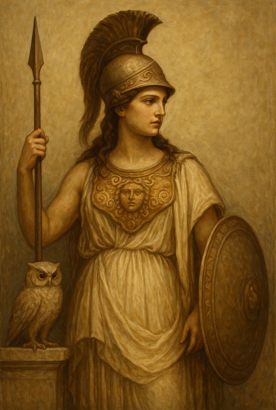 아테나는 다른 신들처럼 짐승을 타거나 사냥을 하지 않았어요. 대신 그녀 곁에는 언제나 부엉이 한 마리가 있었습니다. 이 부엉이는 단순한 애완이나 장식이 아니라,