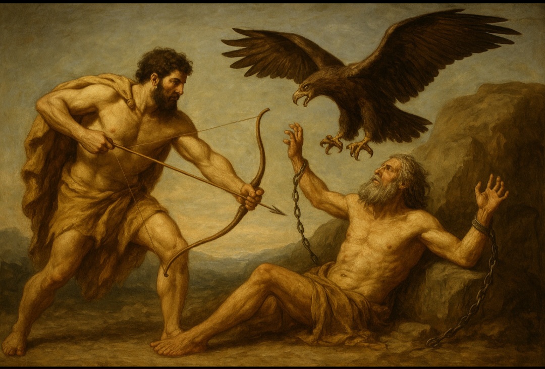 헤라클레스는 활을 들어 강력한 화살로 독수리를 쏘아 죽입니다. 이어서 그는 프로메테우스의 사슬을 끊어